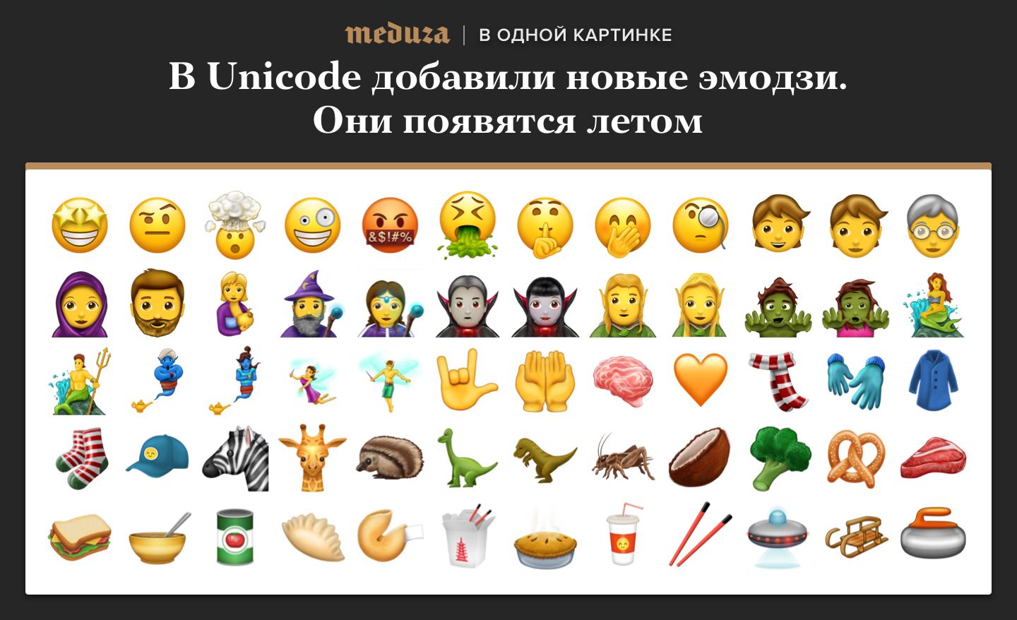 Консорциум Unicode добавил несколько десятков новых эмодзи, в том числе фантастических персонажей, динозавров и гендерно-нейтральные смайлики. Они появятся в телефонах и мессенджерах летом 2017 года.