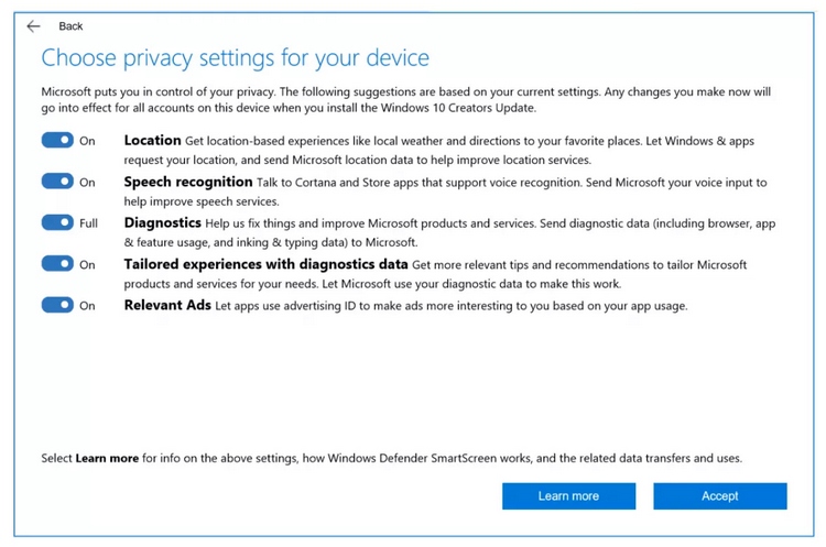По словам Терри Майерсона, пользователи Creators Update смогут переключаться между базовым и полным режимами сбора диагностических данных. Он подчеркнул, что объем информации, собираемой на базовом уровне, сокращен вполовину.