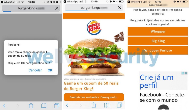 Как отмечается, мошенники распространяют через личные сообщения и группы сообщение об акции в «Бургер Кинге» с бесплатными купонами. К сообщению прикрепляют ссылку на розыгрыш. Для убедительности используют логотип компании и похожий адрес сайта. Поэтому многие могут не заметить обман.