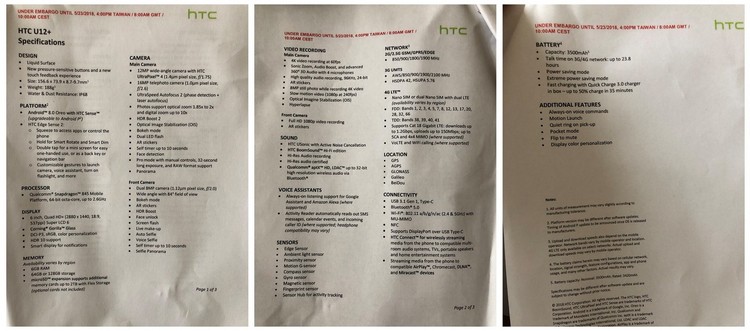 Информация инсайдера несколько противоречит ранним утечкам. Так, HTC U12 Plus получит дисплей в 6 дюймов, а не 5,5. Это матрица Super LCD 3 с соотношением сторон 18 : 9. Сканер отпечатков пальцев разместят сзади, под камерой, а вот функция сканирования лица не появится.
