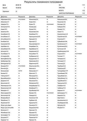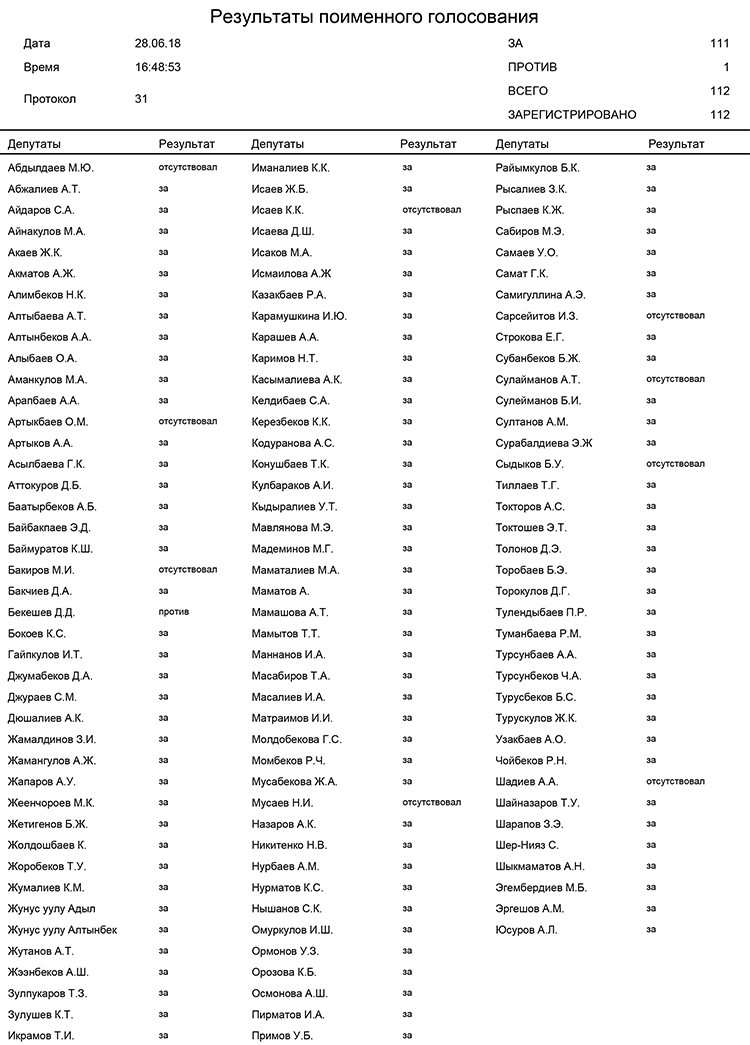 Депутат Жогорку Кенеша Дастан Бекешев опубликовал данные голосования по законопроекту о доступе Финразведки к клиентской базе коммерческих банков.