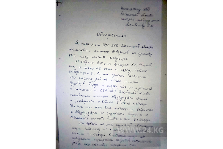 Параллельно с упреками нардепов и озвученными ими же подозрениями о причастности Жениша Разакова к таджикским спецслужбам в Сети появилась его объяснительная, датированная 23 февраля 2010 года. В то время, напомним, он был начальником отдела уголовного розыска УВД Баткенской области.