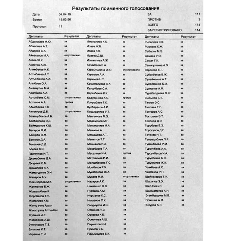 24-kg.com представляет список нардепов, проголосовавших за предложенные изменения. Против, отметим, выступили трое Исхак Масалиев, Анвар Артыков и Асель Кодуранова.