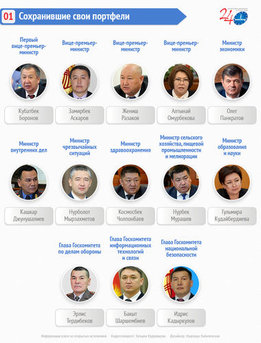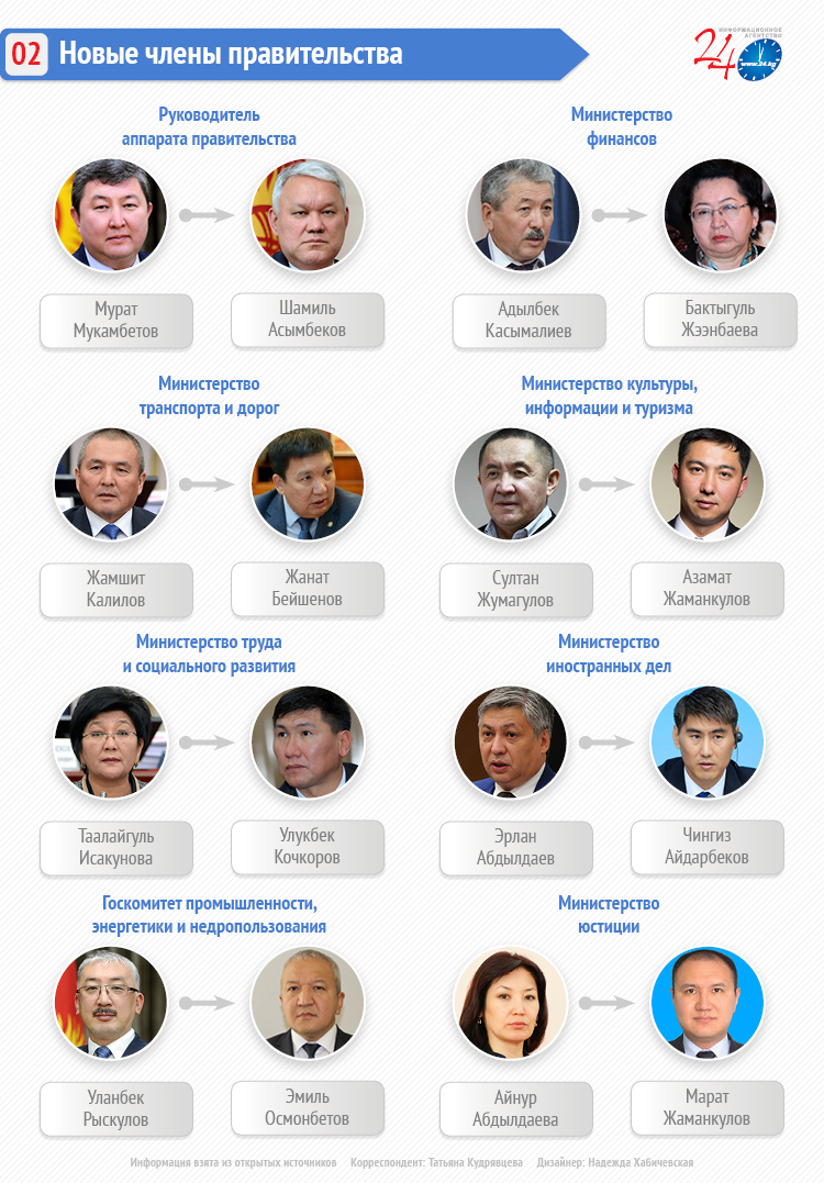 Со скандалом уходили министры труда и социального развития Таалайгуль Исакунова и транспорта и дорог Жамшитбек Калилов. Вместо них пришли Улукбек Кочкоров и Жанат Бейшенов.