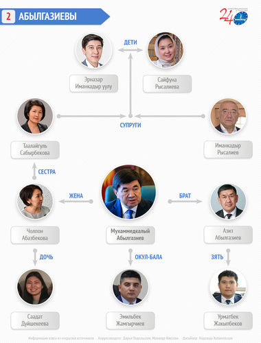 Скандал в компании «КТ Мобайл» с назначениями на должности родственников премьер-министра Мухаммедкалыя Абылгазиева вновь обнажил проблему семейно-кланового правления в Кыргызстане. То, что отдельные семьи существенно влияют на общую ситуацию в стране, а также политические процессы, знают все. Кто они? 24.kg решило напомнить о трех самых известных на сегодня кланах в системе государственного управления.