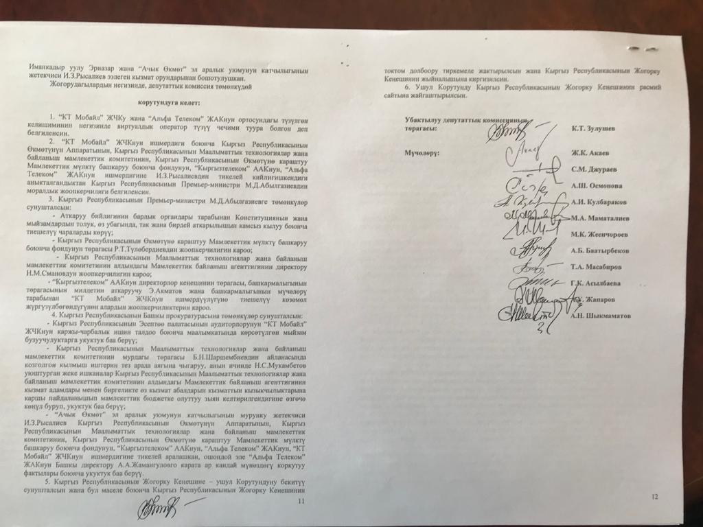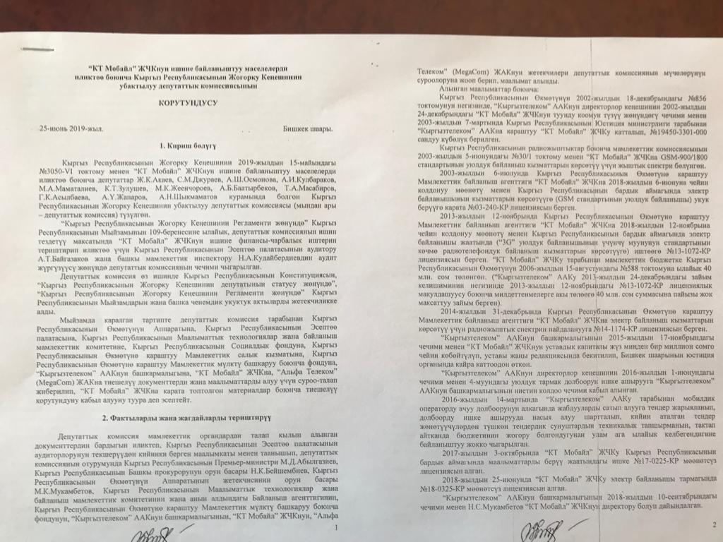 Напомним, комиссия пришла к выводу, что создание «КТ Мобайл» как виртуального оператора было правильным решением. Но в то же время отмечено, что премьер-министр должен признать моральную ответственность за прямое вмешательство его свояка Иманкадыра Рысалиева в деятельность Госкомитета информационных технологий, ФУГИ, Кыргызтелекома, «Альфа-Телекома».