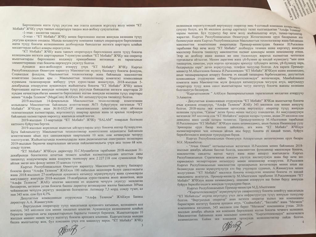 По их сговору «Нур Телеком» получил 100-процентную долю ОсОО «Семь Мобайл» за 2 миллиона 170 тысяч сомов на основании прямого договора купли-продажи и стал владельцем частот 5 МГц и 10 МГц.