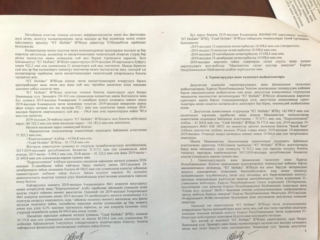 Комиссия отмечает, что из-за отсутствия надзора со стороны руководства ОАО «Кыргызтелеком» в «КТ Мобайл» были допущены нарушения закона. Компания вела работу в нарушение Трудового кодекса, статьи 156 Налогового кодекса и Закона «О бухгалтерском учете».