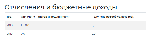 Из-за того, что портал «Открытый бюджет» Минфина не работает в полноценном режиме, выяснить, сколько ТД «Арпа» выплатил налогов и платежей в бюджет, не удалось. Согласно сведениям osoo.kg, в 2018 году — последний год работы компании — от нее поступила 1 тысяча 100 сомов.