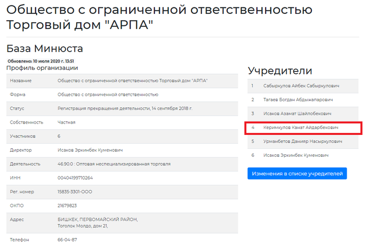 В списке его учредителей, помимо Каната Керимкулова, еще пять человек.