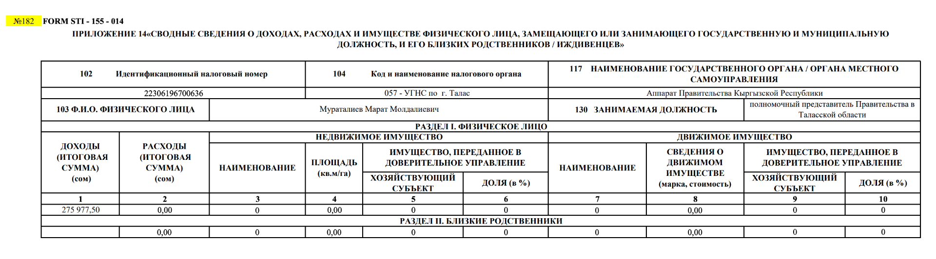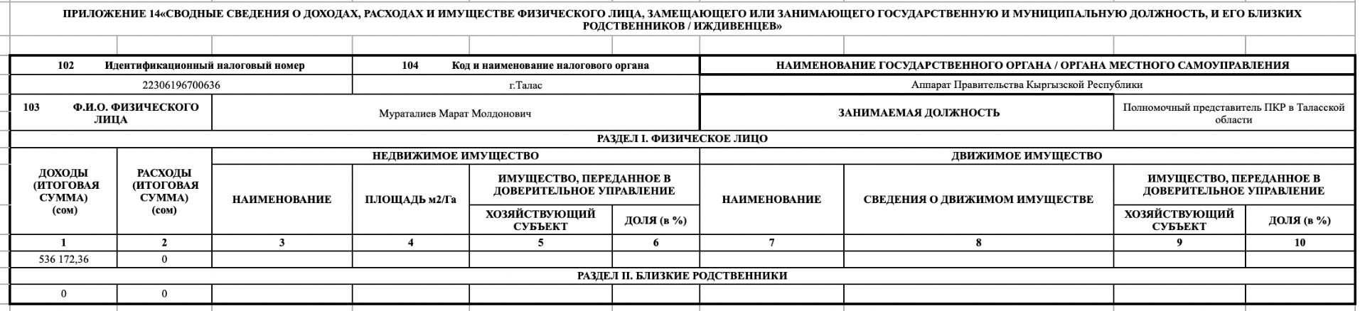В открытом доступе есть только две декларации полпреда за 2017 и 2018 годы. Согласно им, у Марата Мураталиева нет вообще ничего — ни жилья, ни авто, ни какого-либо имущества. Есть только доход, который составил: