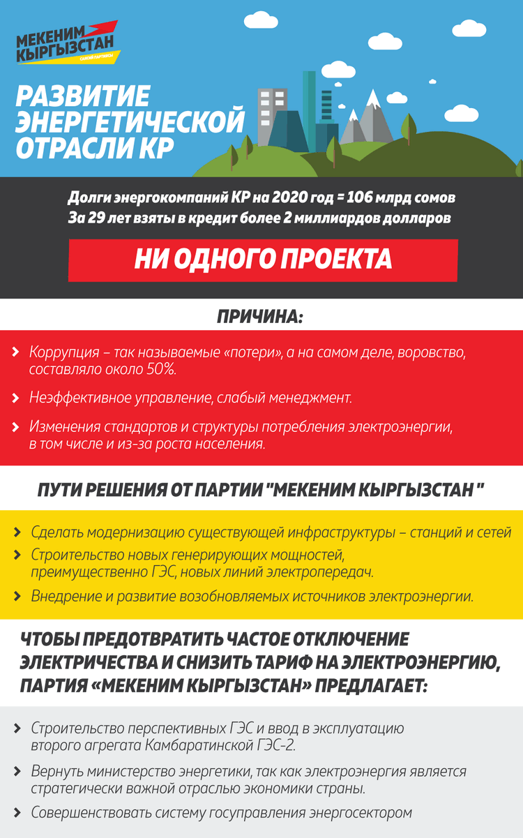 Партия «Мекеним Кыргызстан» для исправления ситуации предлагает вынести на общественное обсуждение стратегию развития энергетики.