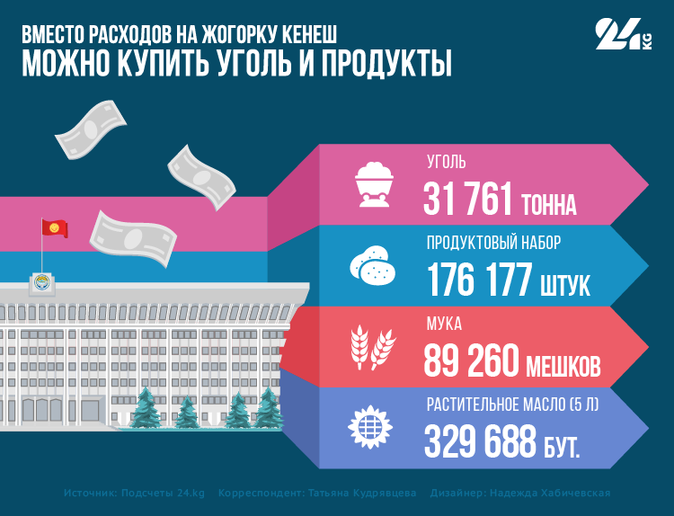 На те средства, что государство потратило на содержание Жогорку Кенеша за последние три месяца, можно купить 31 тысячу 761 тонну угля по 4 тысячи 505 сомов за тонну. Если раздать каждой малоимущей семье по три тонны твердого топлива, то зимой было бы тепло в домах 10 тысяч 587 семей.