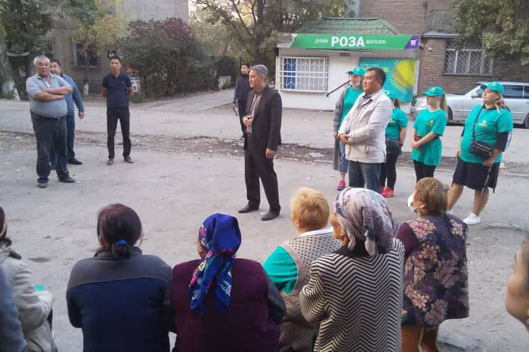 Кандидат в депутаты Жогорку Кенеша от партии «Кыргызстан» Алмаз Сарыбаев проводит встречи с жителями Бишкека. Очередная встреча с избирателями прошла у Института земледелия.