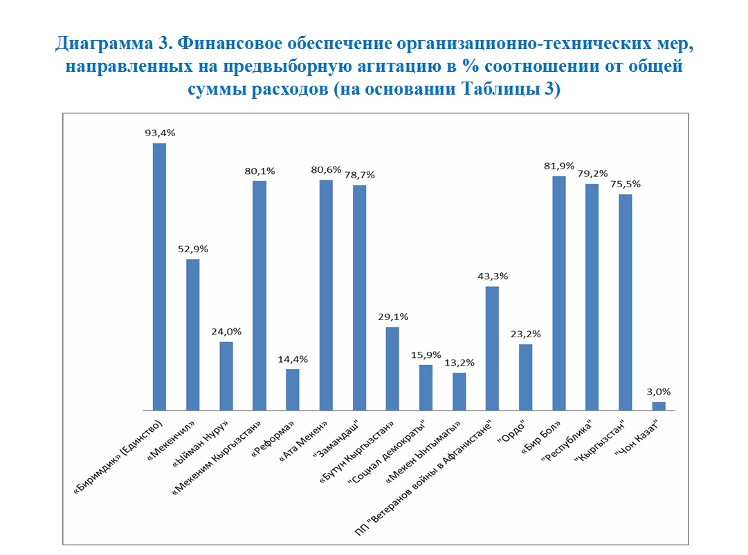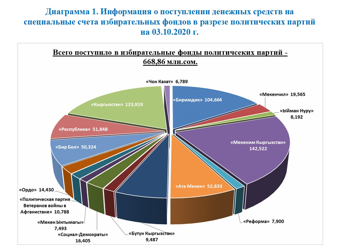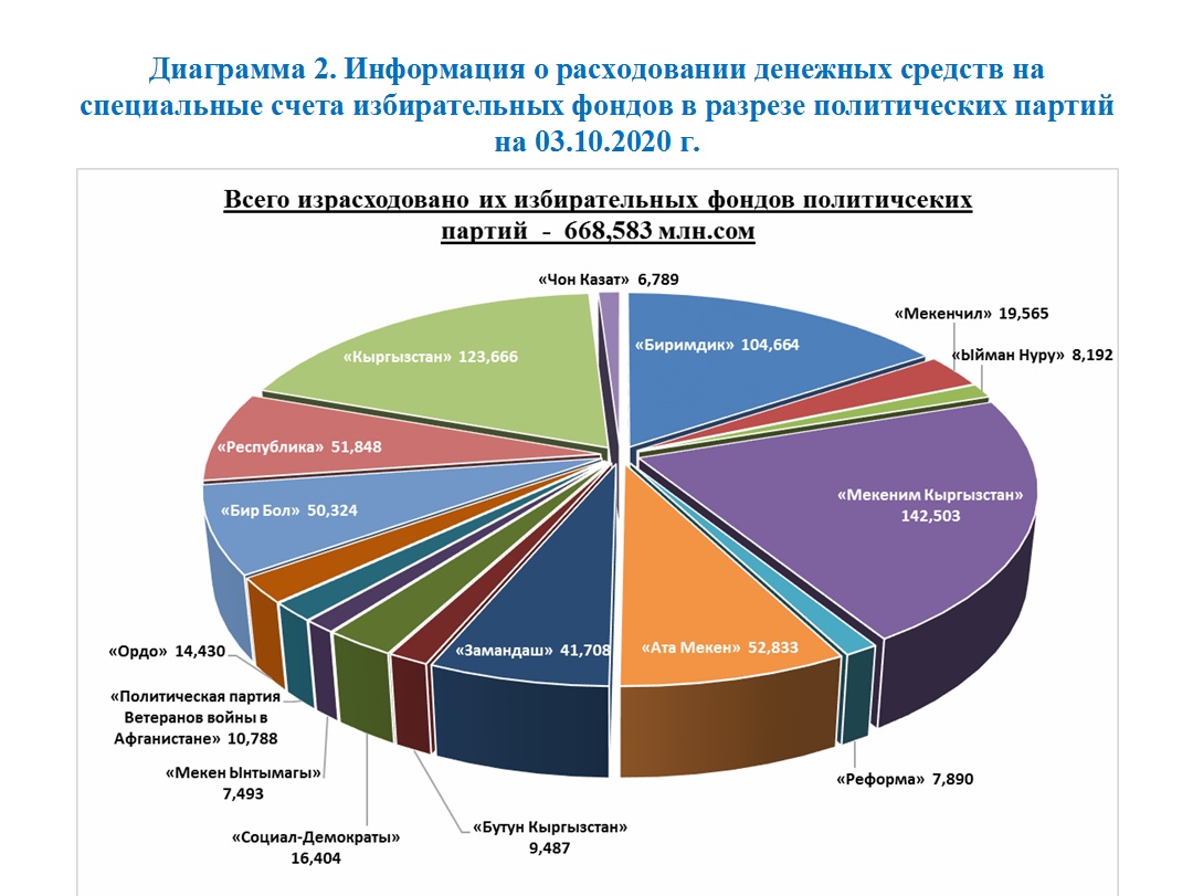 На покрытие расходов, связанных с избирательной кампанией, из средств фондов партий израсходовали 521 миллион 794 тысячи сомов. Из которых на оплату избирательного залога — 80 миллионов. Больше всего денежных средств было израсходовано политическими партиями на предвыборную агитацию — 384 миллиона 839 тысяч сомов. На агитацию через организации телерадиовещания — 150 миллионов 81 тысячу сомов; на агитацию через редакции печатных и интернет-изданий — 108 миллионов 861 тысячу.