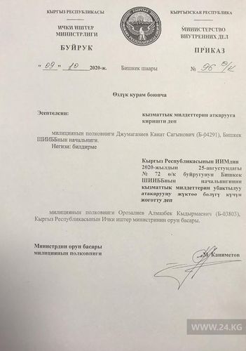 «Этим же приказом Алмазбек Орозалиев продолжает исполнять обязанности министра внутренних дел», — говорится в сообщении пресс-службы ГУВД Бишкека.