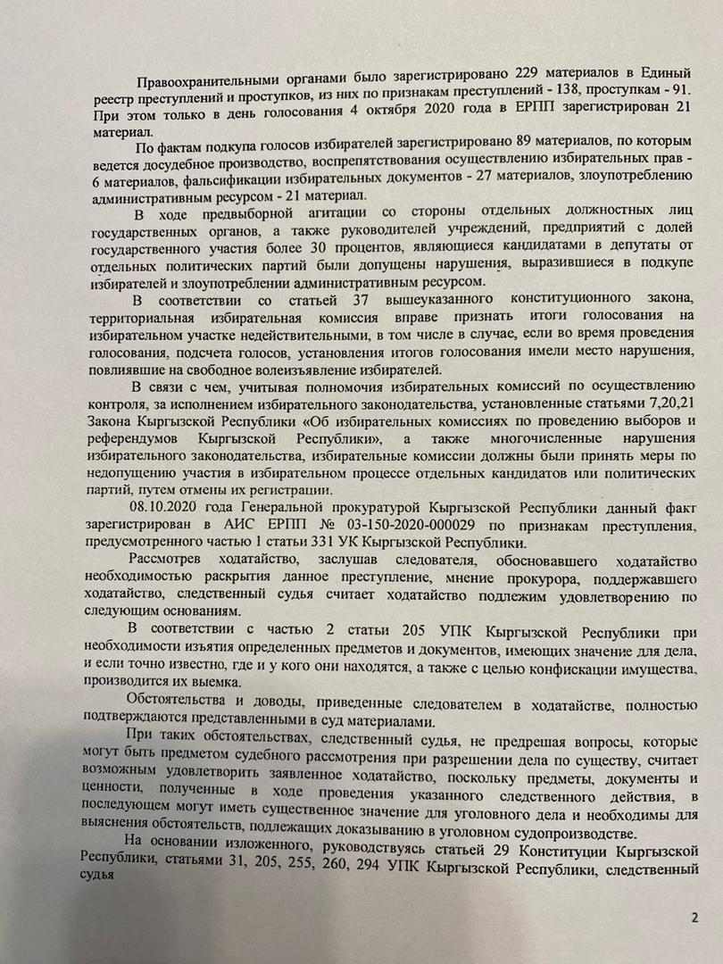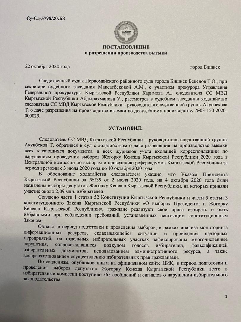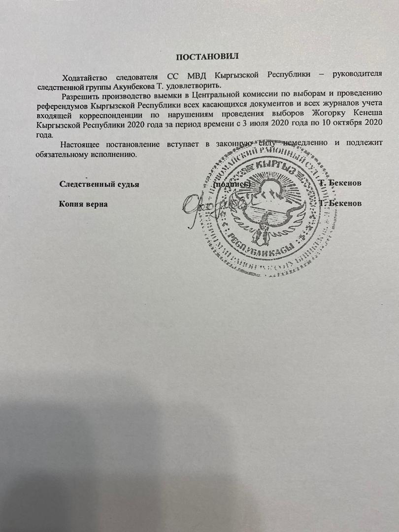 Ранее в суд обратился руководитель следственной группы. Он просил выдать разрешение на выемку всех документов и журналов учета входящей корреспонденции по нарушениям в ходе проведения выборов в Жогорку Кенеш с 3 июля по 10 октября 2020 года.