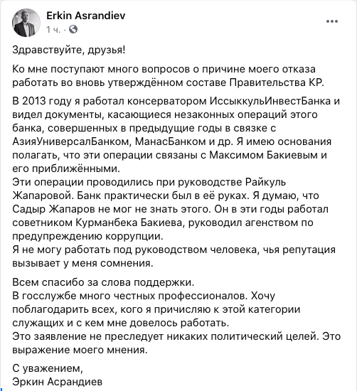 Экс-вице-премьер-министр Эркин Асрандиев объяснил, почему отказался работать во вновь утвержденном составе правительства под руководством Садыра Жапарова.