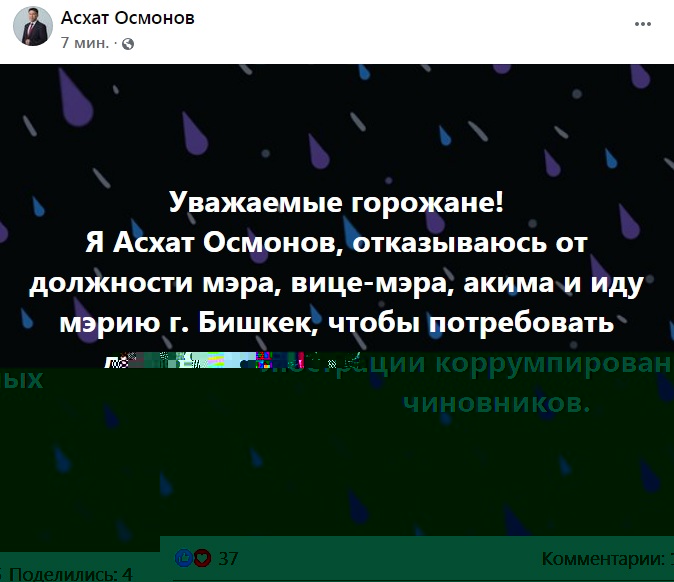 «Я отказываюсь от должности мэра, вице-мэра, акима и иду в мэрию Бишкека, чтобы потребовать люстрации коррумпированных чиновников», — написал Асхат Осмонов.