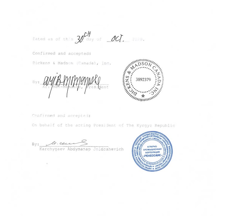 От кыргызской стороны сделку с канадской лоббистской компанией подписал некто Абдыманап Карчыгаев. На документе красуется печать аграрно-промышленной корпорации «Ренессанс».