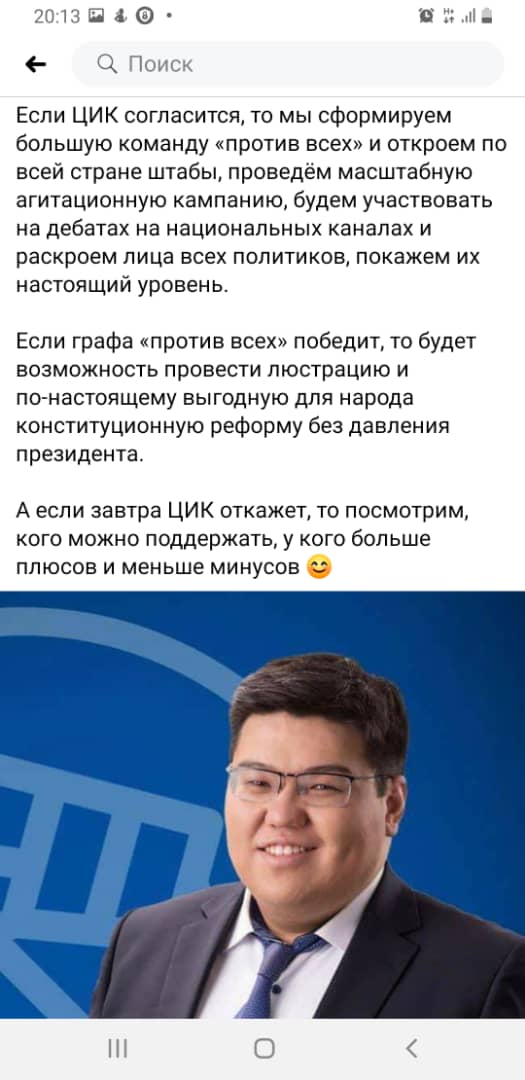 А если завтра ЦИК откажет, то посмотрим, кого можно поддержать, у кого больше плюсов и меньше минусов», — написал Темирлан Султанбеков.