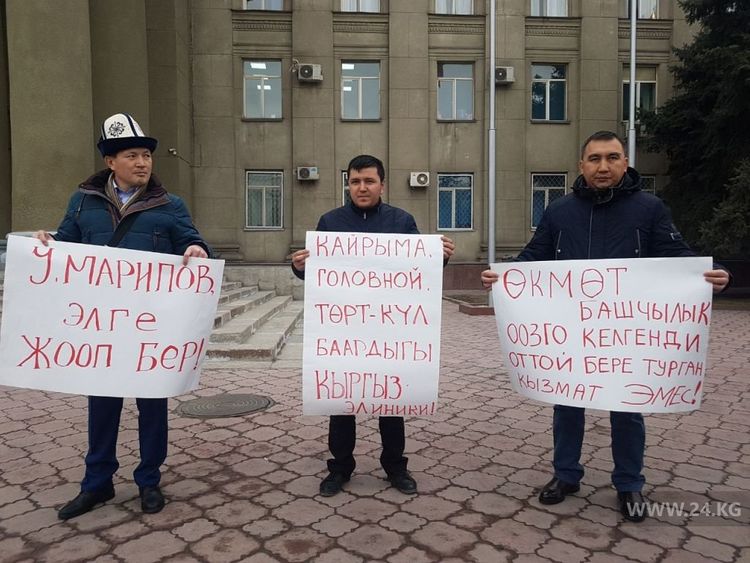 Митингующие у Дома правительства требуют от новоизбранного премьер-министра Улукбека Марипова объяснений насчет заявлений по Торткульскому водохранилищу.
