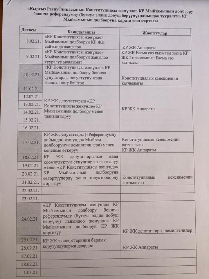 Ранее была опубликована дорожная карта по принятию проекта Основного закона, где указаны сроки и дата проведения обсуждения и заседания профильного комитета Жогорку Кенеша. В ней также предлагалось провести референдум 11 апреля.