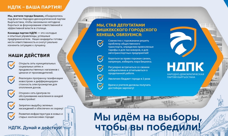 Оплачено ПП НДПК («НАРОДНО-ДЕМОКРАТИЧЕСКАЯ ПАРТИЯ КЫРГЫЗСТАНА») из избирательного фонда (р\счет135100031946372) уполномоченным представителем по финансовым вопросам Аширалиевой Ч.М. Тираж: 1 экземпляр. Дата выпуска 17.03.2021.