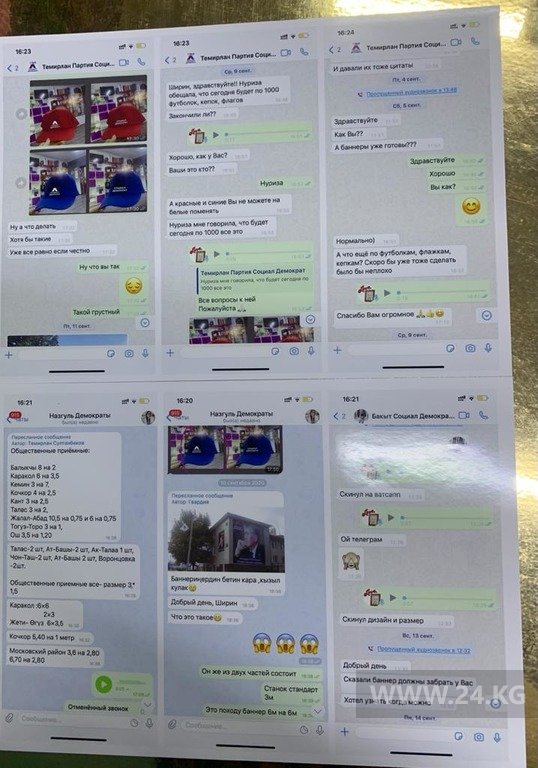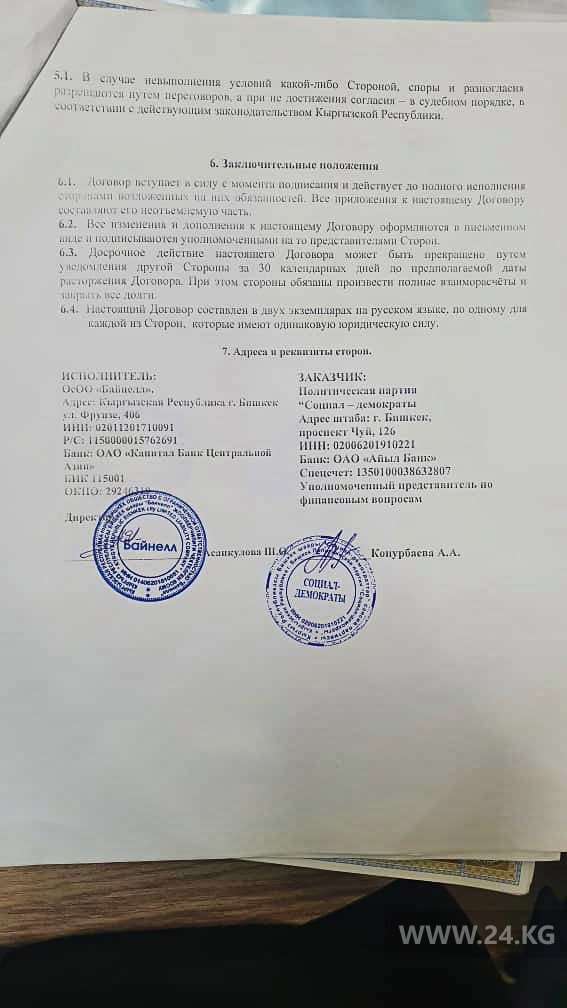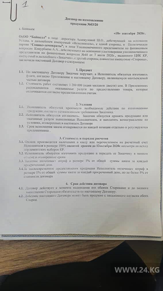 По его словам, 18 сентября 2020 года между ОсОО «Байнелл» и партией СДК был заключен договор на изготовление агитационных предвыборных рекламных материалов (баннеров, флагов). Стоимость услуг составила 1 миллион 200 тысяч сомов.