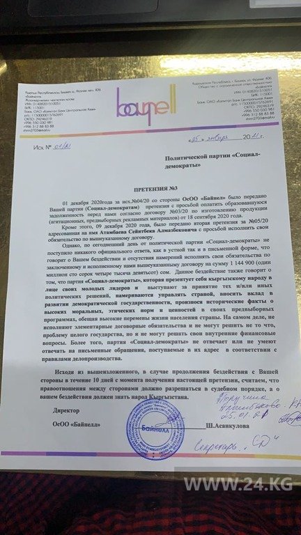 «До сегодняшнего дня представители партии не предпринимают никаких мер по погашению задолженности перед ОсОО «Байнелл». Компания неоднократно отправляла председателю партии, на тот момент Сейитбеку Атамбаеву, претензионные письма с просьбой погасить долг, чтобы урегулировать вопрос в досудебном порядке», — пояснил адвокат.