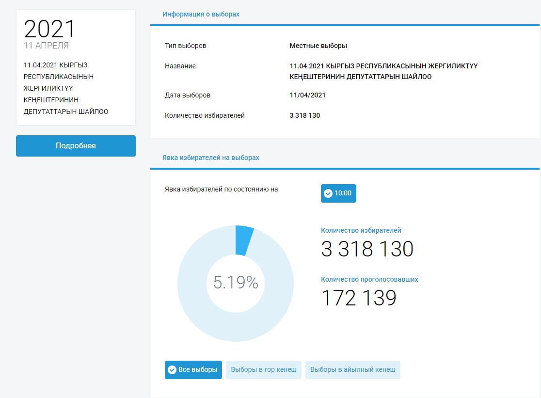 На выборах в городские кенеши проголосовали 49 тысяч 889 человек, или 4,75 процента избирателей. Голоса за депутатов айыльных кенешей отдали 122 тысячи 250 человек, что составляет 5,39 процента от общего списка избирателей.