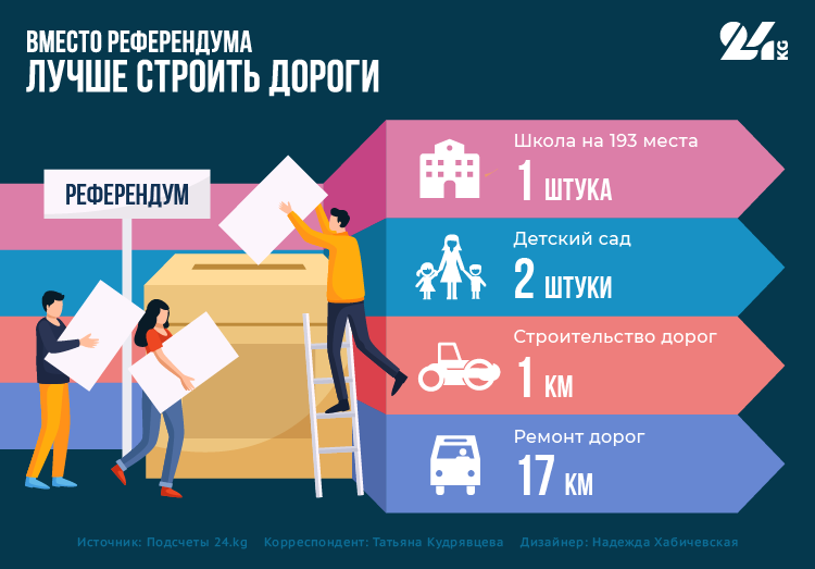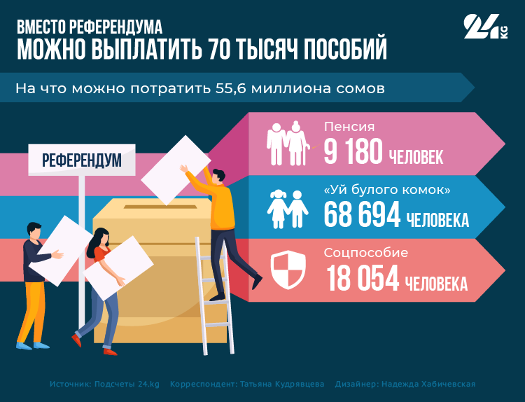 Размер пособия для детей из малоимущих семей «уй булого комок» составляет 810 сомов, а социального пособия — чуть больше 3 тысяч. Вместо референдума можно было выплатить почти 70 тысяч пособий детям и 18 тысяч социальных пособий.Школы, детсады, дороги