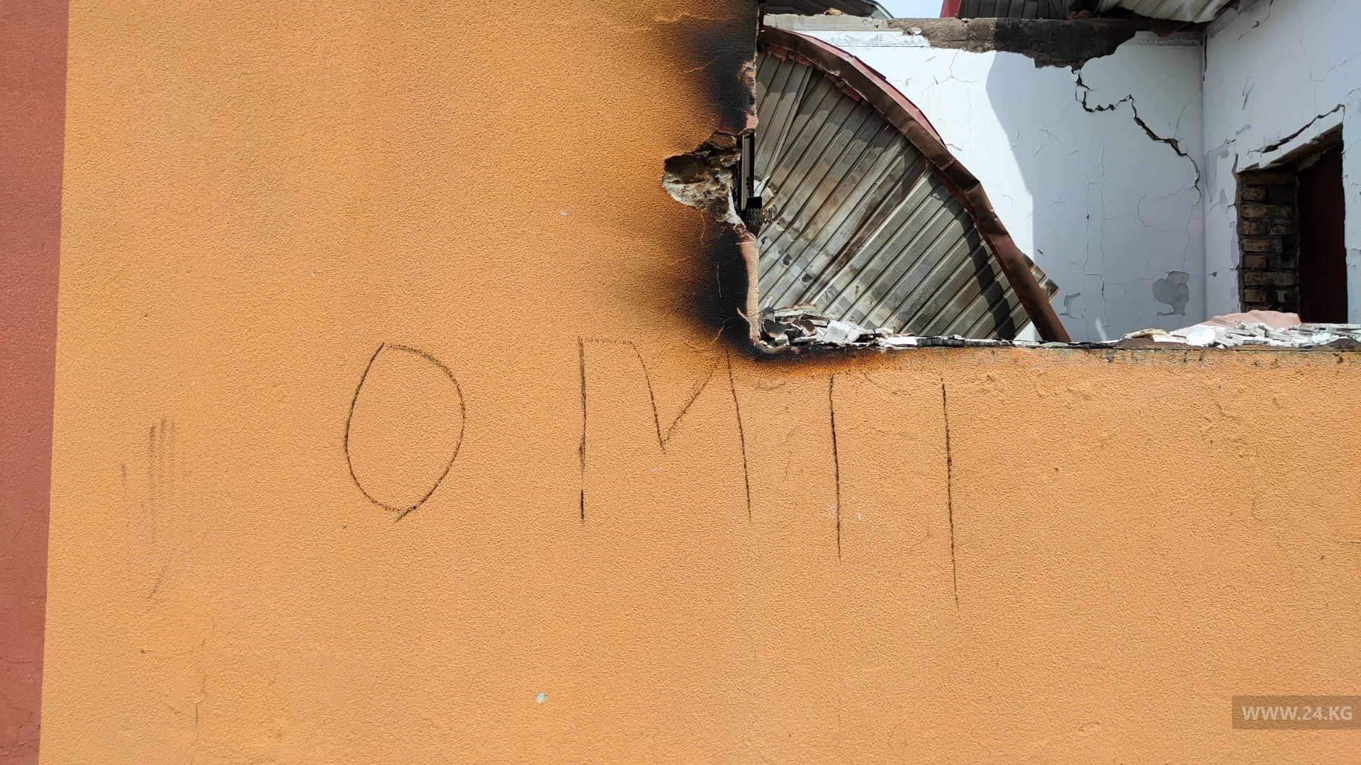 Фото 24-kg.com. Надпись на сгоревшем участковом пункте милиции в Максате