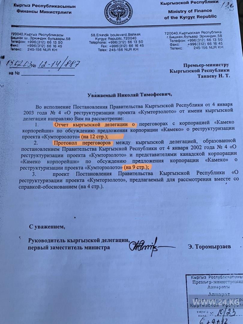Однако в распоряжении 24.kg есть фото официального письма первого заместителя министра финансов. Эмирлан Торомырзаев отправляет премьер-министру Николаю Танаеву официальное письмо. Этим письмом чиновник внес на рассмотрение отчет кыргызской делегации о переговорах с корпорацией «Камеко» по обсуждению проекта по реструктуризации «Кумторзолото». Кроме того, главе правительства представили протокол переговоров и проект постановления правительства о реструктуризации «Кумторзолото».