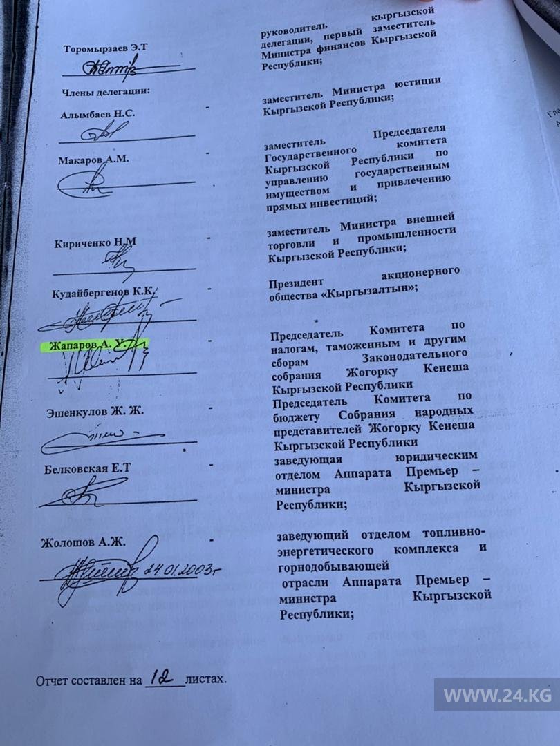 Ныне глава госкомиссии по проверке работы «Кумтора» депутат Жогорку Кенеша Акылбек Жапаров ранее заявил, что еще в 2003 году был против манипуляций вокруг золотого вопроса. Однако в Сети появился документ, опровергающий его слова.