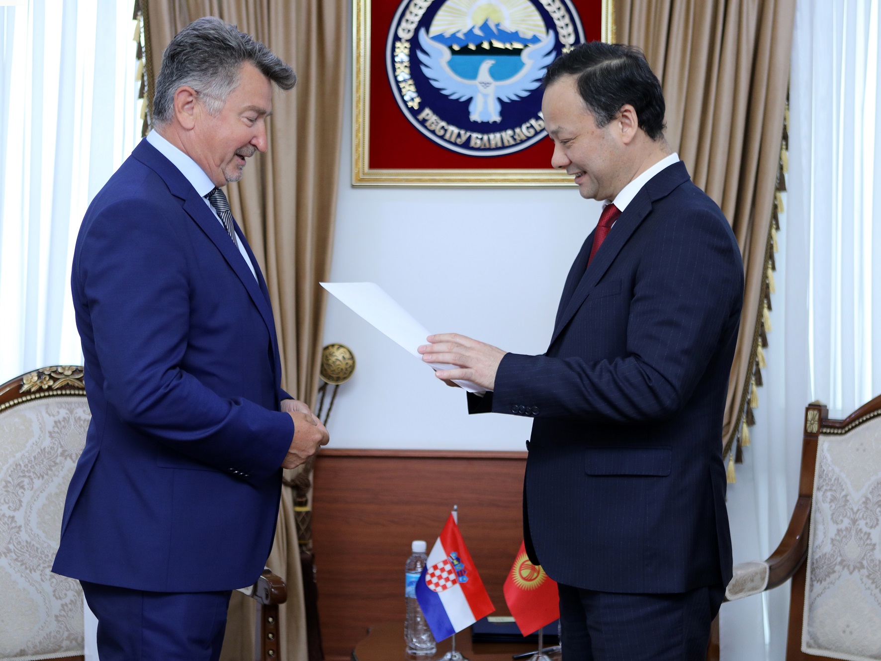 Руслан Казакбаев принял нового Посла Республики Хорватия в Кыргызской Республике Рефика Шабановича по случаю вручения им копий верительных грамот. В ходе встречи стороны обсудили ряд актуальных вопросов состояния и перспектив двустороннего сотрудничества между странами, а также обменялись мнениями по планируемым мероприятиям. В частности, стороны подтвердили сроки проведения первых политических консультаций между министерствами иностранных дел Кыргызстана и Хорватии, на уровне заместителей министров иностранных дел.