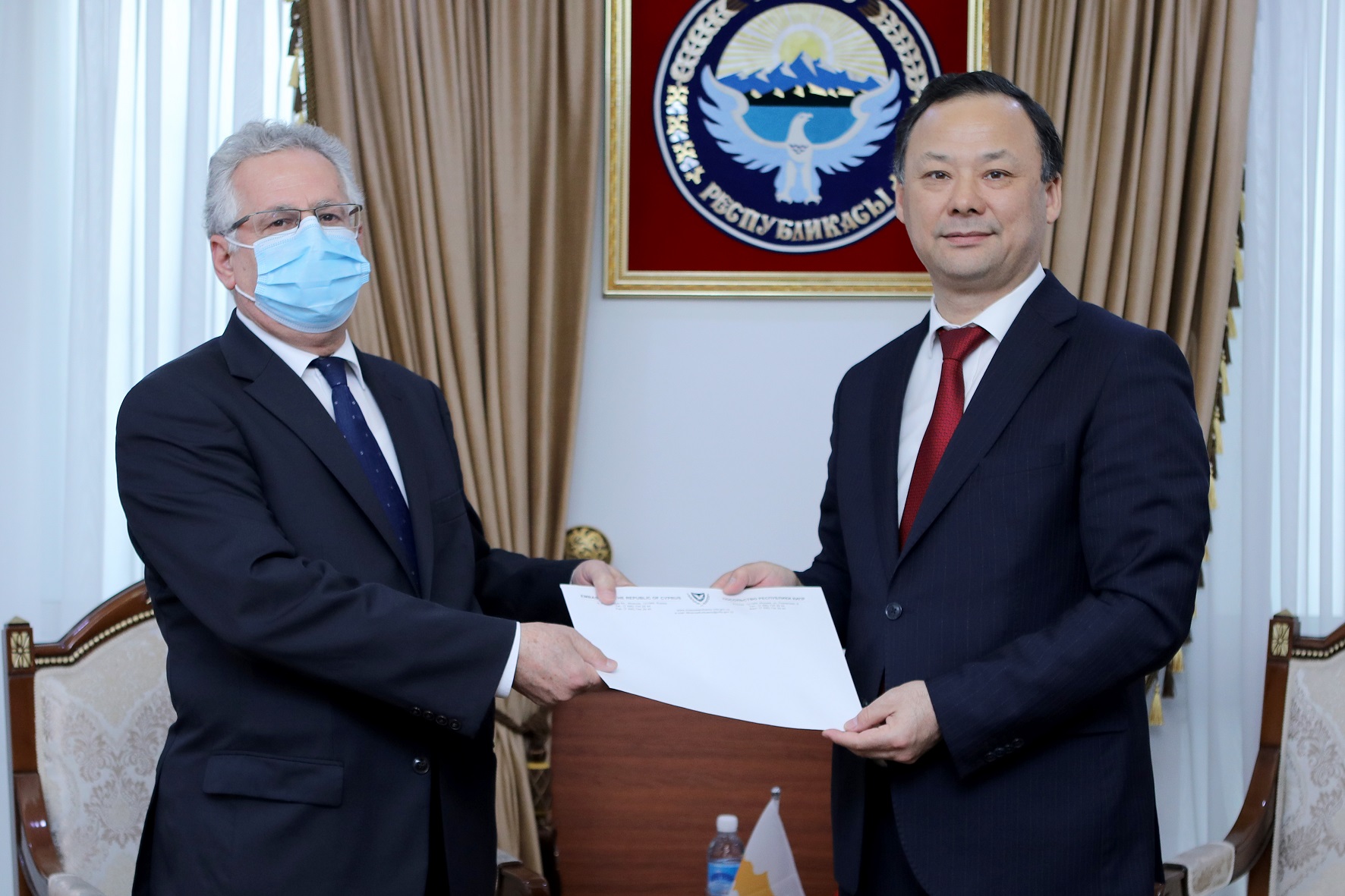 Министр иностранных дел Кыргызской Республики Руслан Казакбаев принял Чрезвычайного и Полномочного Посла Республики Республики Кипр в Кыргызской Республике (с резиденцией в Москве) Андреаса Зиноноса.
