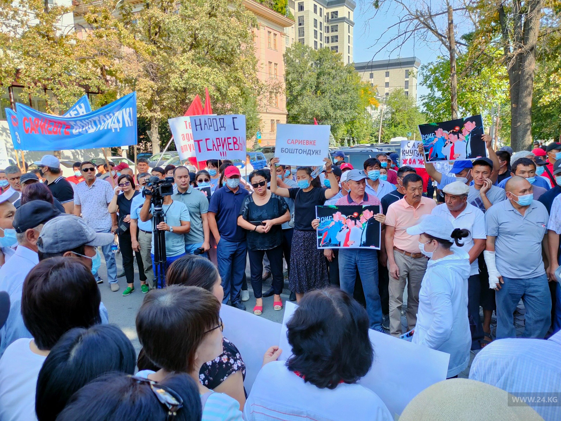 Около 400 человек с плакатами скандируют «Сариев!». Они не согласны с решением горсуда. Самого экс-премьер-министра уже увезли в СИЗО ГКНБ.