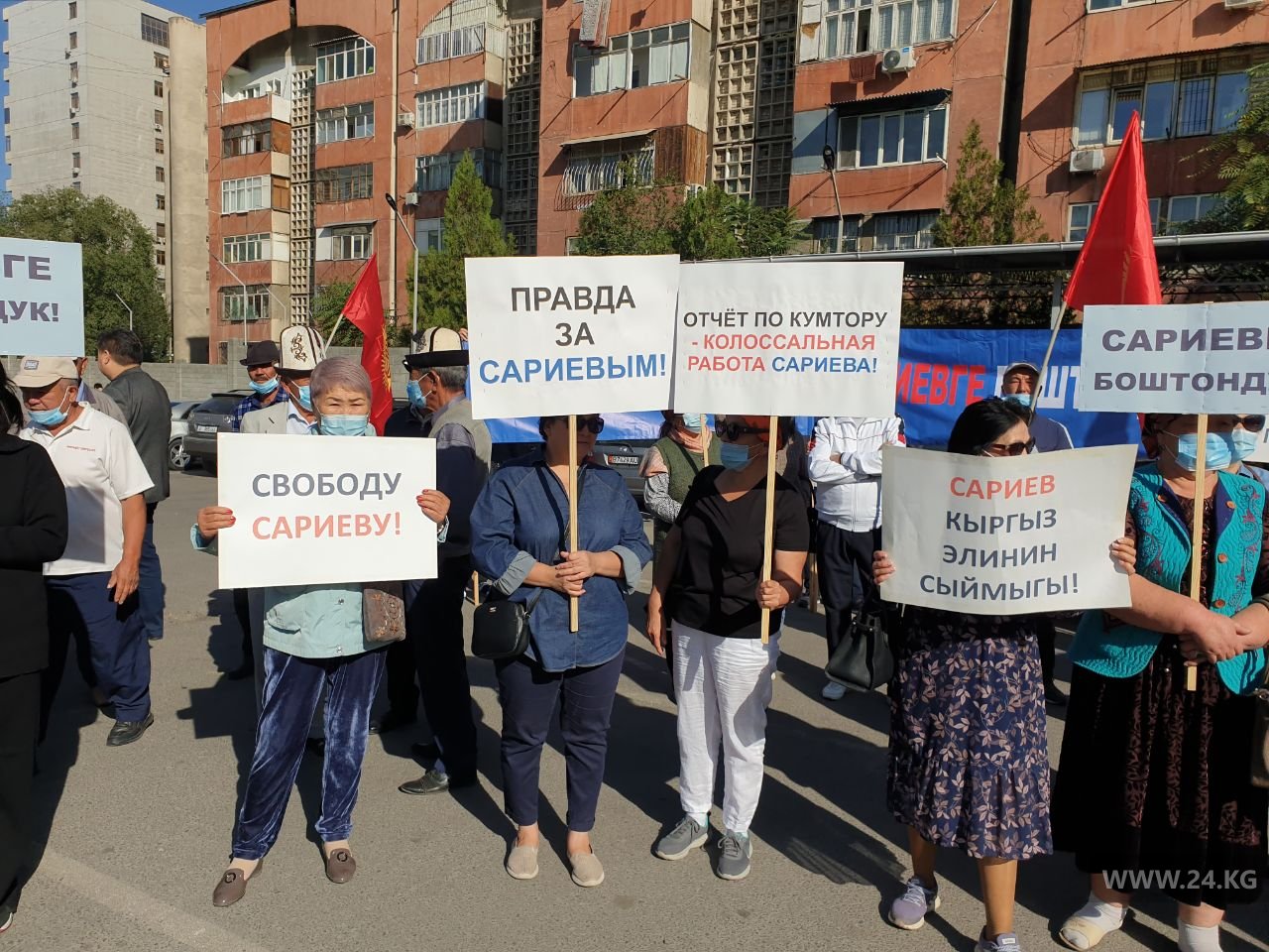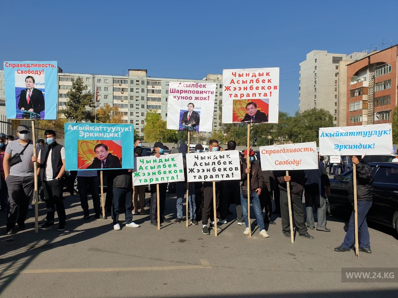Здесь собрались около 100 сторонников депутата парламента Асылбека Жээнбекова и экс-премьер-министра Темира Сариева. Участники акций протеста требуют освобождения бывшего чиновника и действующего депутата. Обоих должны привезти на продление меры пресечения.