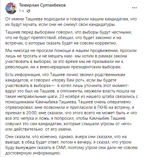 «От имени Ташиева подходили и говорили нашим кандидатам, что их будут мучать, если они не снимут свои кандидатуры... Есть информация, что Ташиев лично звонил родственникам кандидатов, и говорил: «порву Вам рот, если вы будете участвовать в выборах». Я хотел лишь уточнить этот момент. Вдруг это был не Ташиев, а оппоненты. 23 ноября из нашего штаба связались с помощниками Камчыбека Ташиева, Ташиев очень оперативно отреагировал, мне позвонили и пригласили в ГКНБ на встречу. Я приехал в 20:00, мне сказали, что этого всего не может быть, и что все это чепуха и ложь. Я попросил, чтобы Камчыбек Ташиев озвучил это сам кандидатам, которые слышали угрозы от «него» или действительно от его имени», — написал Темирлан Султанбеков.