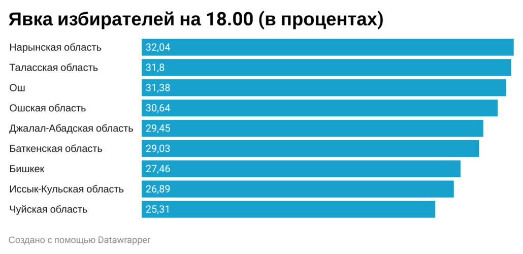 Всего голоса по единому избирательному округу отдали 1 миллион 50 тысяч 163 человека. Самая высокая явка в Нарынской и Таласской областях, самая низкая — в Иссык-Кульской и Чуйской областях.