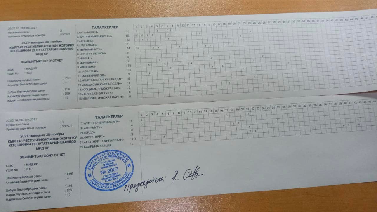 По предварительным итогам, в УИК № 9007 проголосовали 319 избирателей из 1 тысячи 591. Партия «Ата Журт Кыргызстан» получила 117 голосов. На втором месте «Бутун Кыргызстан» — 83, на третьем «Ыйман Нуру» — 34.