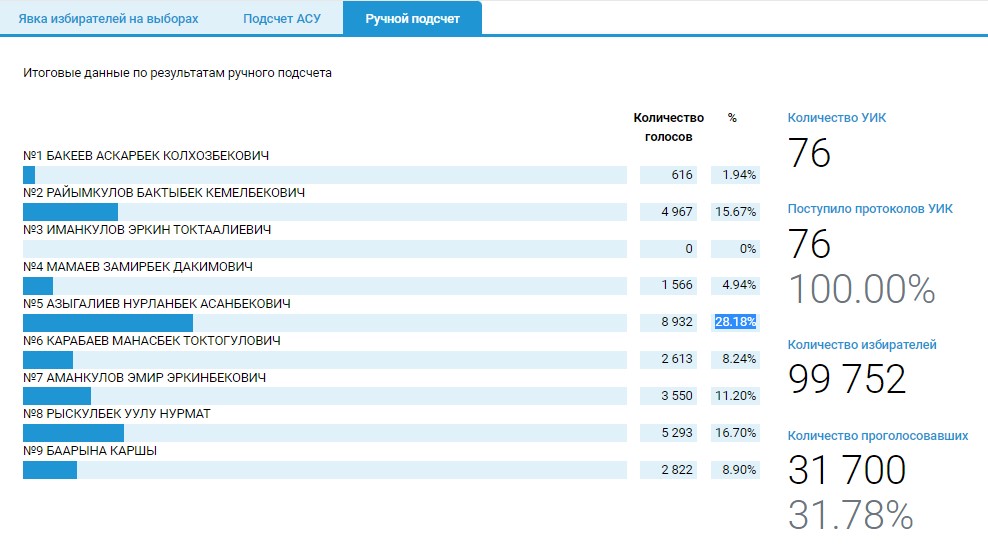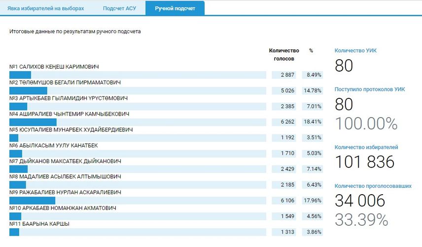 Уже поступило 100 процентов протоколов с УИК Баткенского округа. Согласно им, лидер гонки сменился. По данным АСУ, победу одержал Нурлан Ражабалиев (19,16 процента). По итогам ручного подсчета — Чынтемир Аширалиев (18,41 процента).