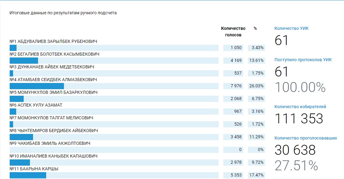 Уже поступило 100 процентов протоколов с УИК Аламединского округа. Согласно им, лидер гонки не поменялся. По данным АСУ, победу одержал сын бывшего президента Алмазбека Атамбаева Сеид (26,29 процента). По итогам ручного подсчета у него 26,03 процента.