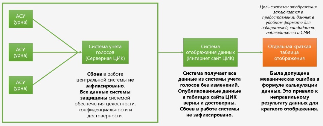 Сервер автоматически публикует данные на сайте информационной избирательной системы ЦИК (ИИС), обозначенного красным квадратом. «Специалист ЦИК ошибочно удвоил цифру (механическая ошибка при написании формулы калькуляции) при публикации данных голосования на сайте ИИС, полученных с АСУ. Но через некоторое время специалист ЦИК произвела исправление формулы в визуализации данных. При этом, отмечаем, что в АСУ и в основной системе данные остаются неизменными. Данная система не дает сбоев. Сегодня она также работает исправно. Эта ошибка была одинаковой не только для непрошедших партий, но и для всех», — говорится в сообщении ЦИК.