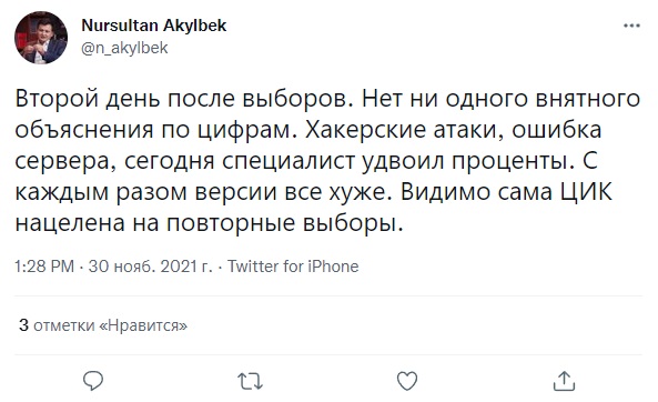 Ранее на сайте Центризбиркома произошел сбой: были опубликованы данные с ошибкой. Позже там объяснили, что разработаны две программы по системе избрания депутатов — система автоматического подсчета голосов в урне и программа свода данных и их отображения. «На сайт сначала загрузили не ту программу», — сообщила председатель ЦИК Нуржан Шайлдабекова.