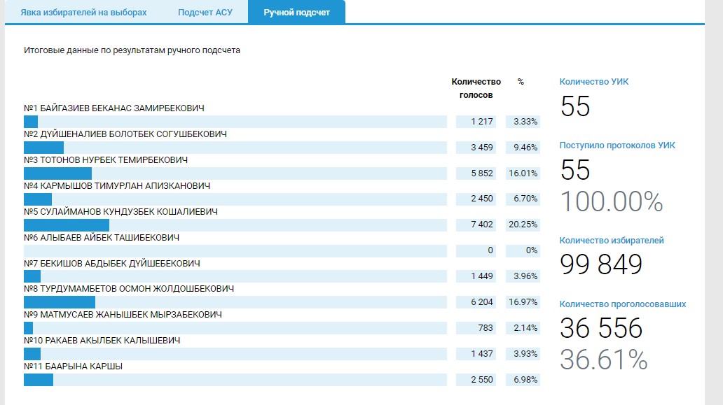 В первом Ырысбек Атажанов набрал 16,33 процента голосов избирателей (по данным АСУ, 16,97 процента), во втором победу одержал Кундузбек Сулайманов. Он набрал 20,25 процента (по данным АСУ, 20,51 процента).
