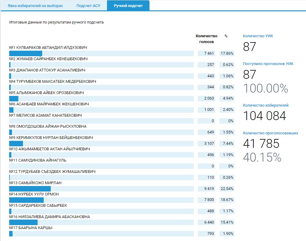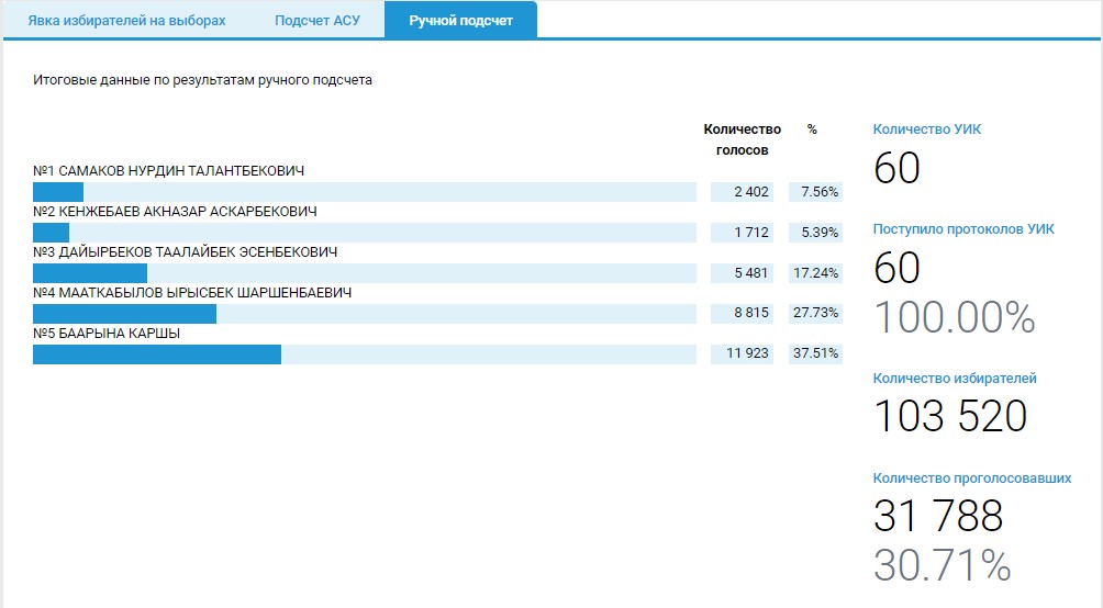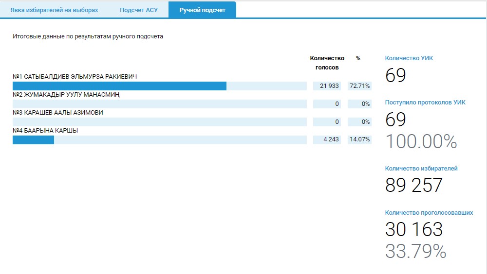 Так, поступило 100 процентов протоколов от УИК Узгенского, Кочкорского и Свердловского избирательных округов. Согласно подсчету, лидеры гонки не поменялись.