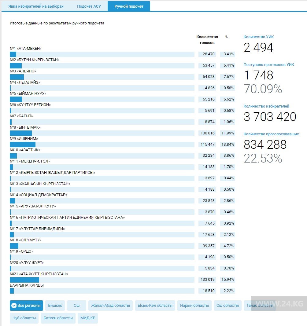 По данным с этих участков, пятипроцентный порог по единому округу пока преодолевают партии «Ата Журт Кыргызстан», «Ынтымак», «Ишеним», «Ыйман Нуру», «Альянс», «Бутун Кыргызстан». «Эл умуту», которая долгое время держалась в группе лидеров, начала сдавать позиции.В системе опубликованы итоги по 35 округам, пока данных нет только по Первомайскому, где по данным АСУ больше всего голосов отдано за позицию «против всех».