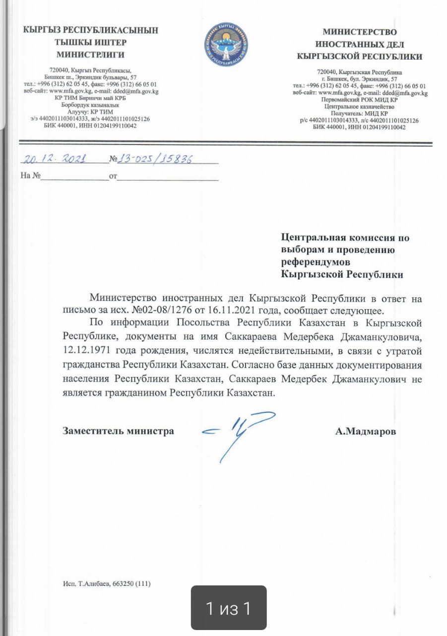 Казахстанское гражданство кандидата в депутаты по Чуй-Кеминскому избирательному округу № 31, набравшего большинство голосов Медербека Саккараева, признано недействительным. Такой ответ получил МИД Кыргызстана на запрос в соответствующие органы РК.
